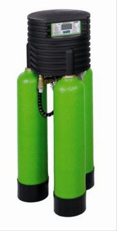 Dreifachanlage für durchgehenden Weich-wasserbetrieb mit durchflussmengen-abhängiger Steuerung und Sparbesalzungzur Erzeugung von vollenthärtetemWasser.bestehend aus:3 Austauscherbehälter, einschließlichSpezialverteilersystem3 Füllungen mit Ionenaustauschermaterialund Spezialkies zur totraumfreienWasserverteilung3 höhenverstellbare Adapter mitProbeventilen und Turbinenwasserzähler1 patentiertes Zentralsteuerventil ausentzinkungsbeständigem Messing,bestehend aus Transferventil inkl.Rückflussverhinderer, Regenerations-ventil, verschleißarmen Keramikschei-ben, vorgeschalteter Druckminderer undWasserzähler1 Schaltkasten "GENO-IONO-matic" zurSteuerung aller Funktionen der Anlagemit LCD-Informationsanzeige füraktuellen Betriebszustand, Uhrzeit,Restkapazität, momentanem Durchfluss,Stunden seit letzter Regeneration undFehlermeldung, mit 3-Tasten-Bedienung,automatischer Regenerationsauslösungsowie Anlagenumschaltung über Wasser-mengenimpulsgeber oder Handauslösung,elektrischer potentialfreier Stör-meldekontakt und serielle Schnitt-stelle RS 485 für ZLT-Ausgabe,komplett verdrahtet1 Desinfektionseinrichtungnach dem Elektrolyseverfahren1 Salztank mit Deckel, Siebboden undSpezialsoleventil mit Sicherheits-schwimmer sowie Solepuffertechnologie1 Wasserprüfeinrichtung "Gesamthärte"1 ausführliche, bebilderte Montage-anleitung mit BetriebshandbuchFür hygienebewussten Betrieb gemäß denVorgaben der VDI 6023 sorgt die Frisch-wassergarantie: unmittelbar bevor der inRegeneration befindliche Austauscher inBetrieb geht, wird dieser gespült, damitein frisch desinfizierter und regene-rierter Austauscherbehälter zur Verfü-gung steht.Lieferung der Anlage in vormontiertenBaugruppen zur zeitsparenden Montage.Technische Daten:Anschluss Steuerventil: 1 1/4" R (AG)Nenndurchfluss : 5,0 CM/hDruckverlust beiNenndurchfluss : 0,8 barGesamtkapazität : 3x79CMxGraddHNenndruck (PN) : 10 barWasserdruck min. : 2,0 bar (Ü)Wasserdruck max. : 10,0 bar (Ü)Wassertemperatur max. : 30 Grad CSalzverbrauch/Regeneration : 2,5 kgFabrikat: Grünbeck - 5